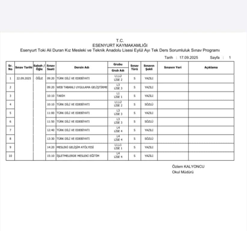 2025 2026 Eğitim Öğretim Yılı Eylül Ayı Tek Ders Sınavları