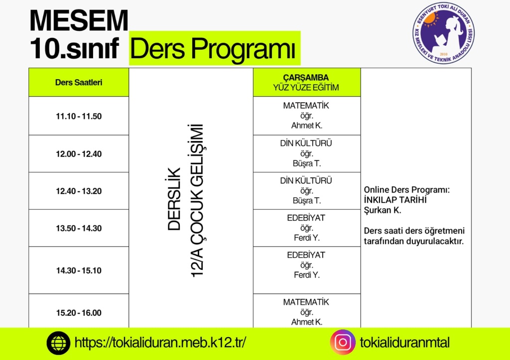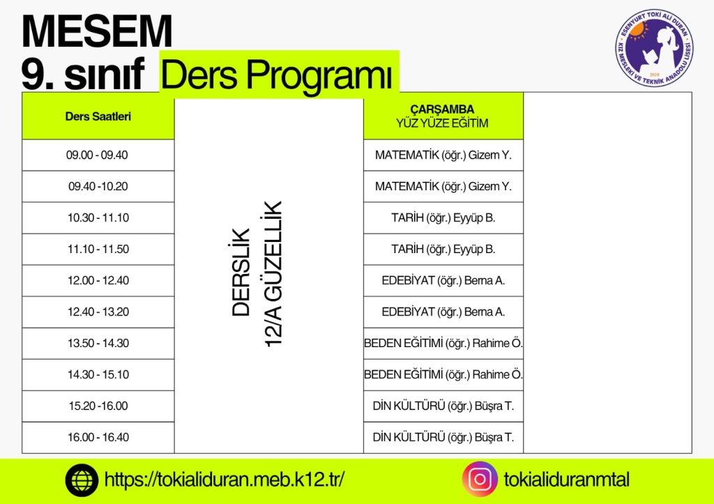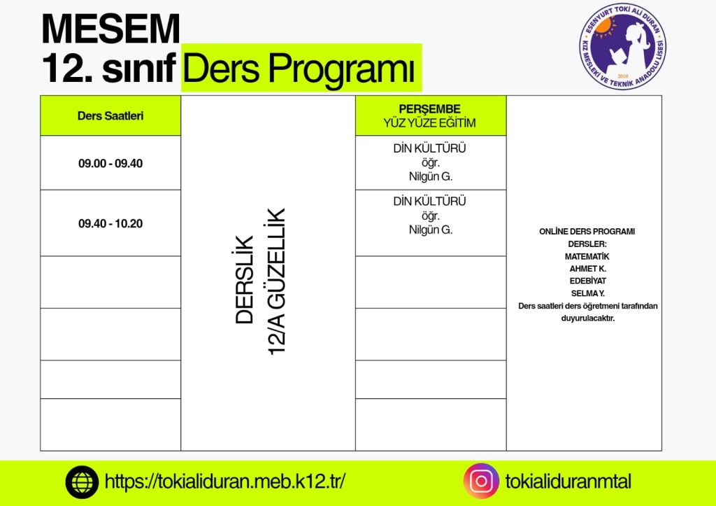 2025-2026 Eğitim Öğretim Yılı Mesem Ders Programı